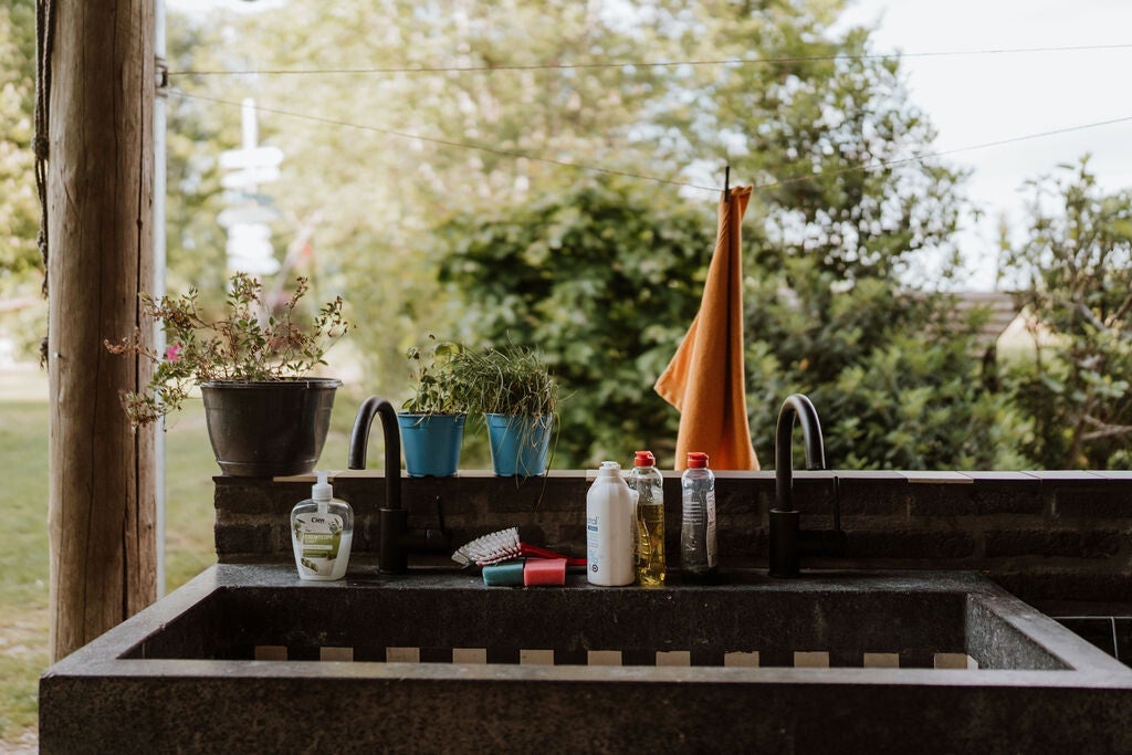 Deze sprookjesachtige caravan staat aan de rand van het terrein en heeft een eigen buitenplek met struiken eromheen. Op dit ‘pleintje’ voor de caravan tref je een buitenkeuken en een picknicktafel die bij de caravan horen.